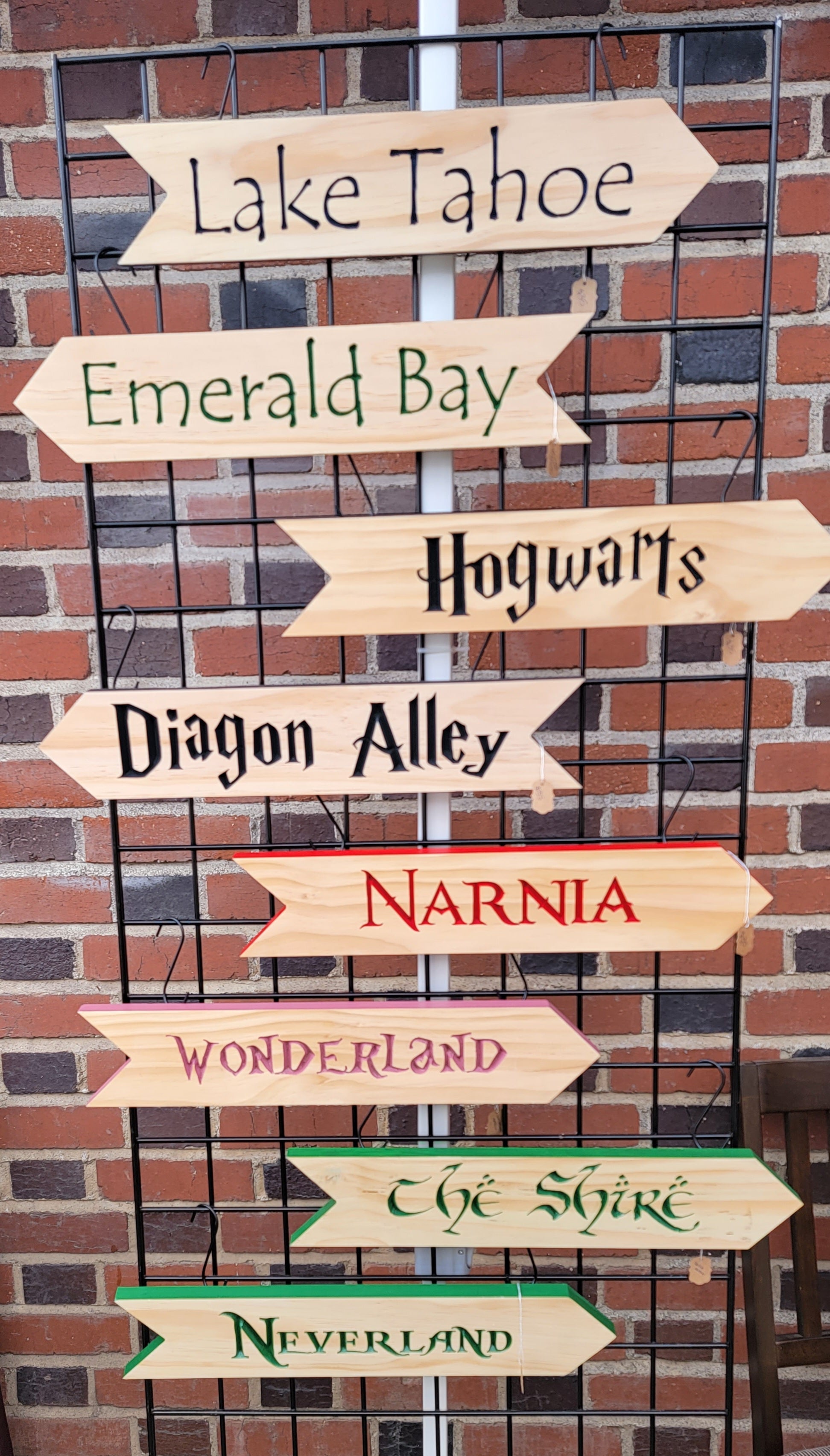 Have a favorite fandom or maybe you have a bunch of them. Create your own signpost with your favorite fantasy, sci-fi, movie, video game, or even a favorite vacation destination. They are made from solid wood and are coated for indoor or outdoor use.