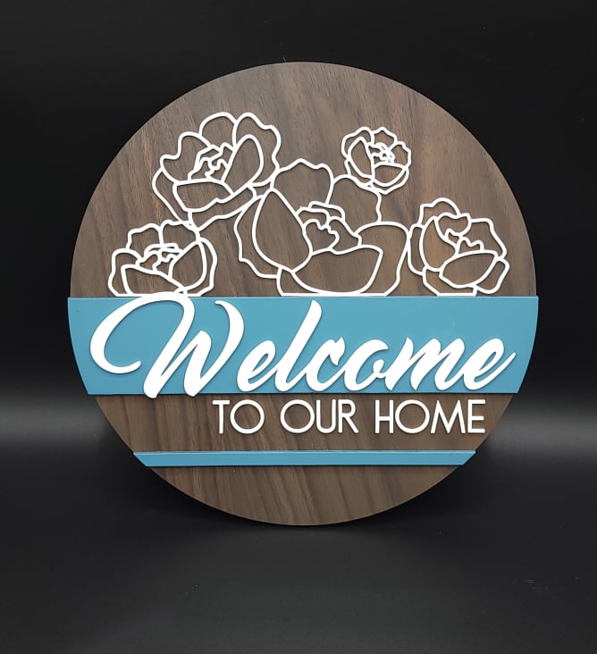 This nice floral outline welcome sign adds a nice pop of color to your door or entry way. It features multilayer construction of painted and stained wood, white acrylic, and a string hanger on the back.