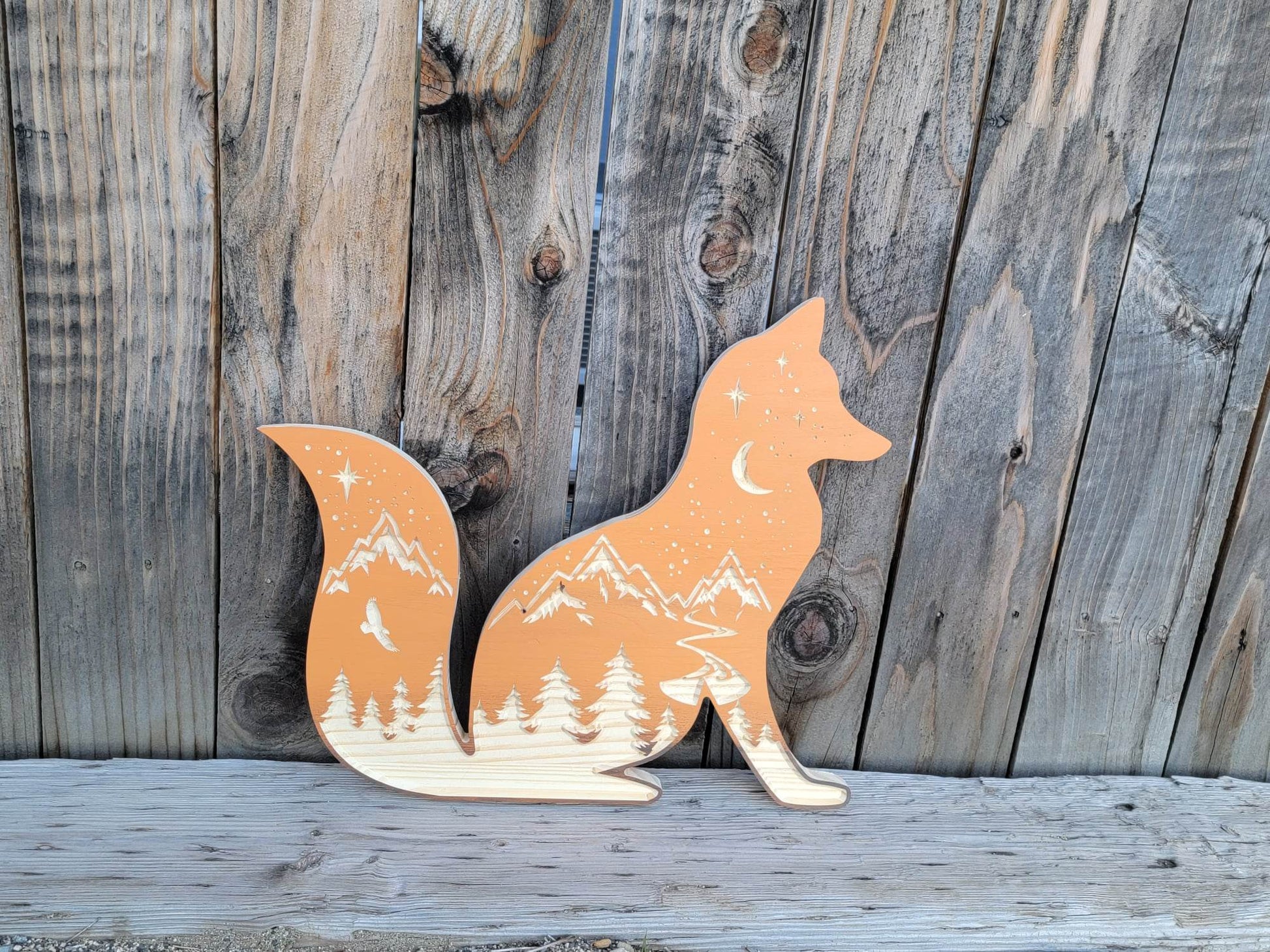 This beautiful wood carving of a fox features a mountain scape and star background. Carved out of solid pine this amazing piece with add a conversation to any room.