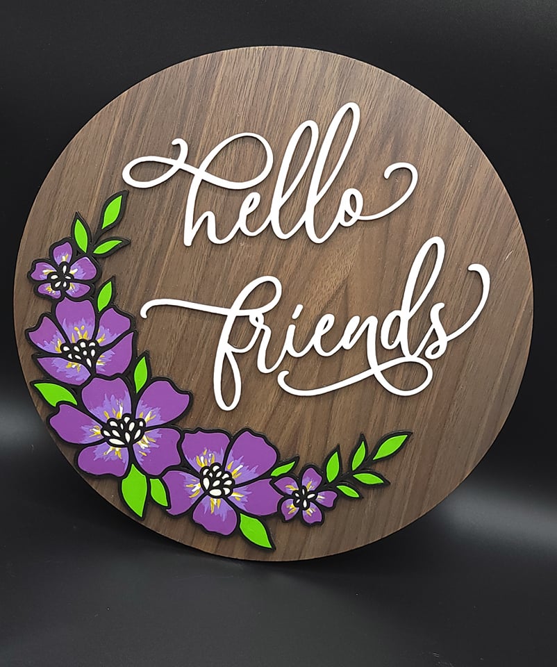 This delightful welcome sign offers a beautifully hand painted floral design accenting the “Hello Friends” welcoming people into your home. It features multilayer construction of painted and stained wood and a string hanger on the back.