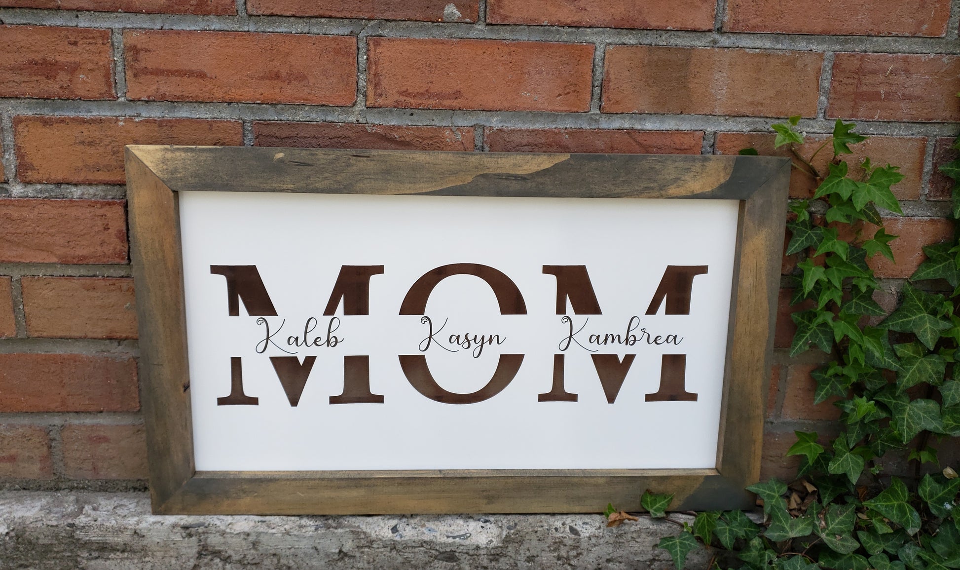 This beautiful sign is a split letter design featuring children's or grand children's names in the middle. The artwork is laser engraved for fine details. And come in a handmade solid wood frame. This item is customized and made to order.