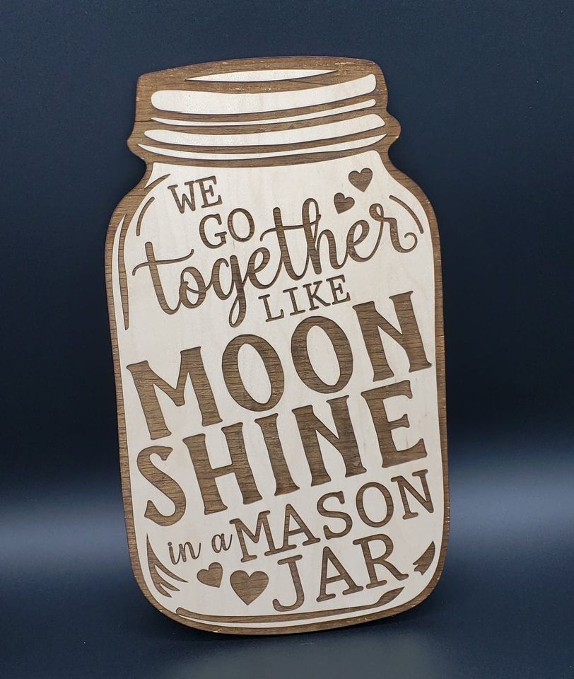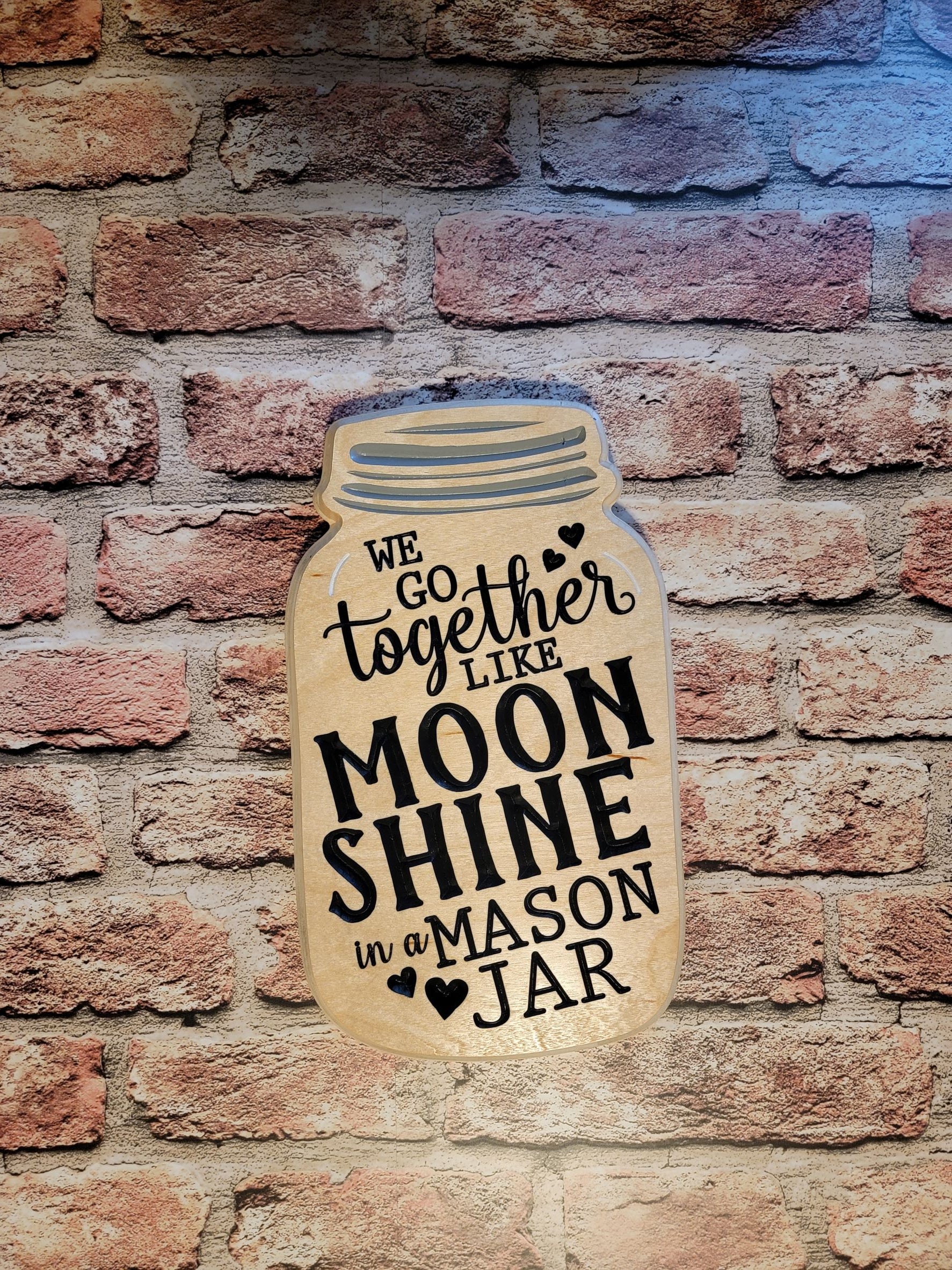 This 12” shelf décor features an adorable “We go together like moonshine and a mason jar” engraved into a wooden mason jar cut out.