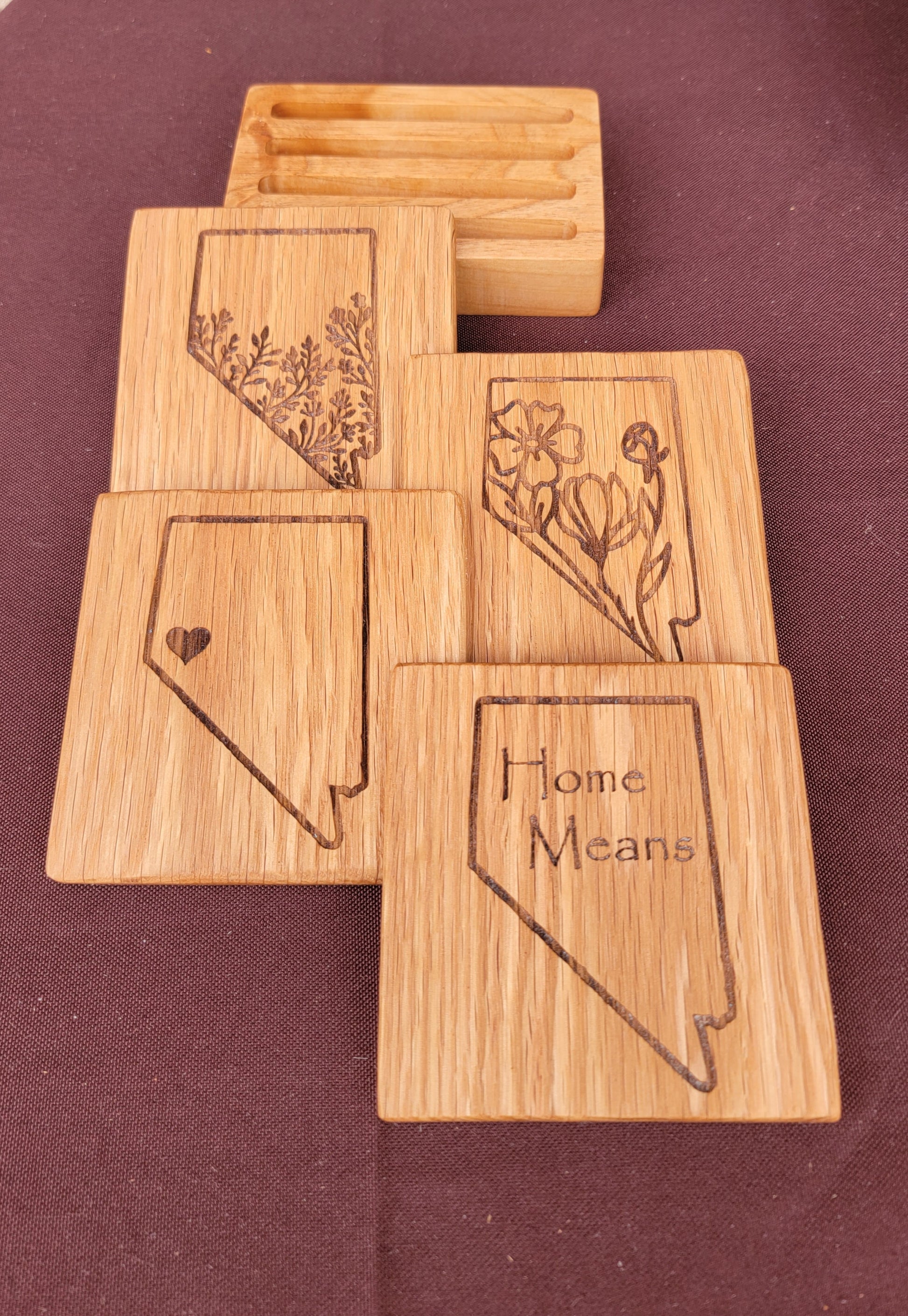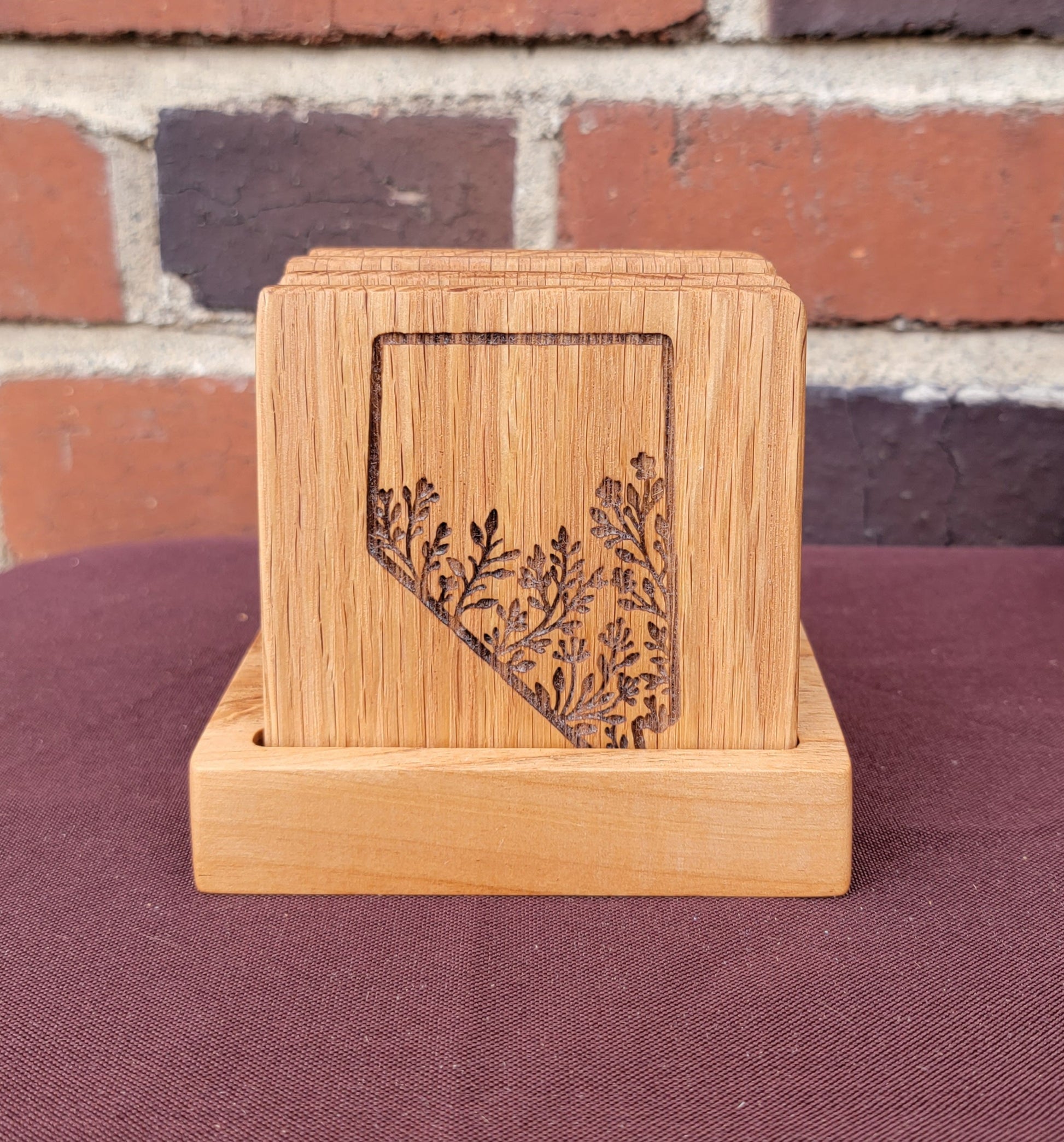These Nevada inspired coaster sets are handmade then laser engraved and rubbed down with a beeswax and orange oil to enhance the natural wood grain. The coasters are made from Red Oak or Walnut. The coaster holders are made from reclaimed wood. (Species may vary)