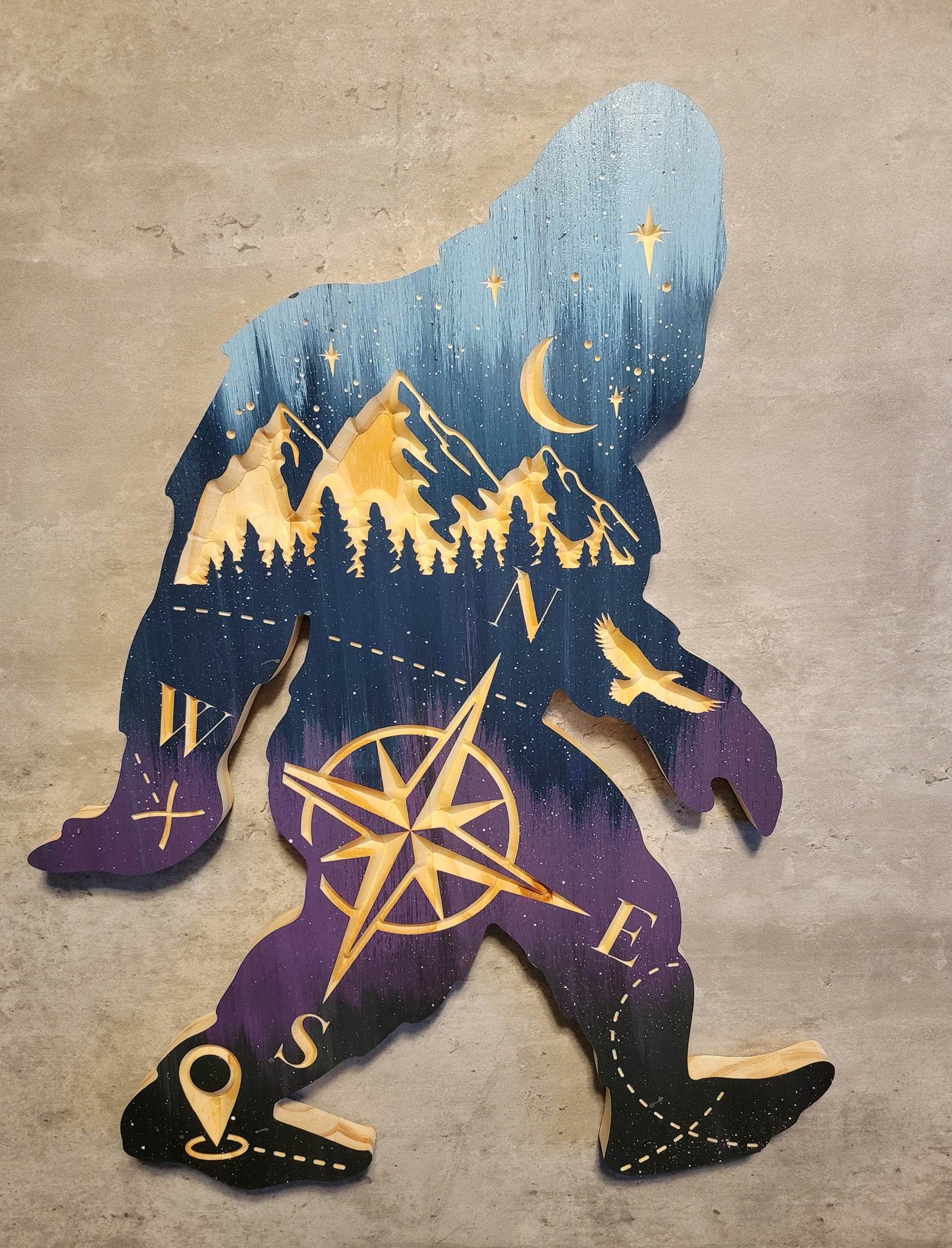 Do you believe? This amazing wood carving of sasquatch features a mountain scape and compass background with an umbra paint scheme. Carved out of solid pine this amazing piece with add a conversation to any room.